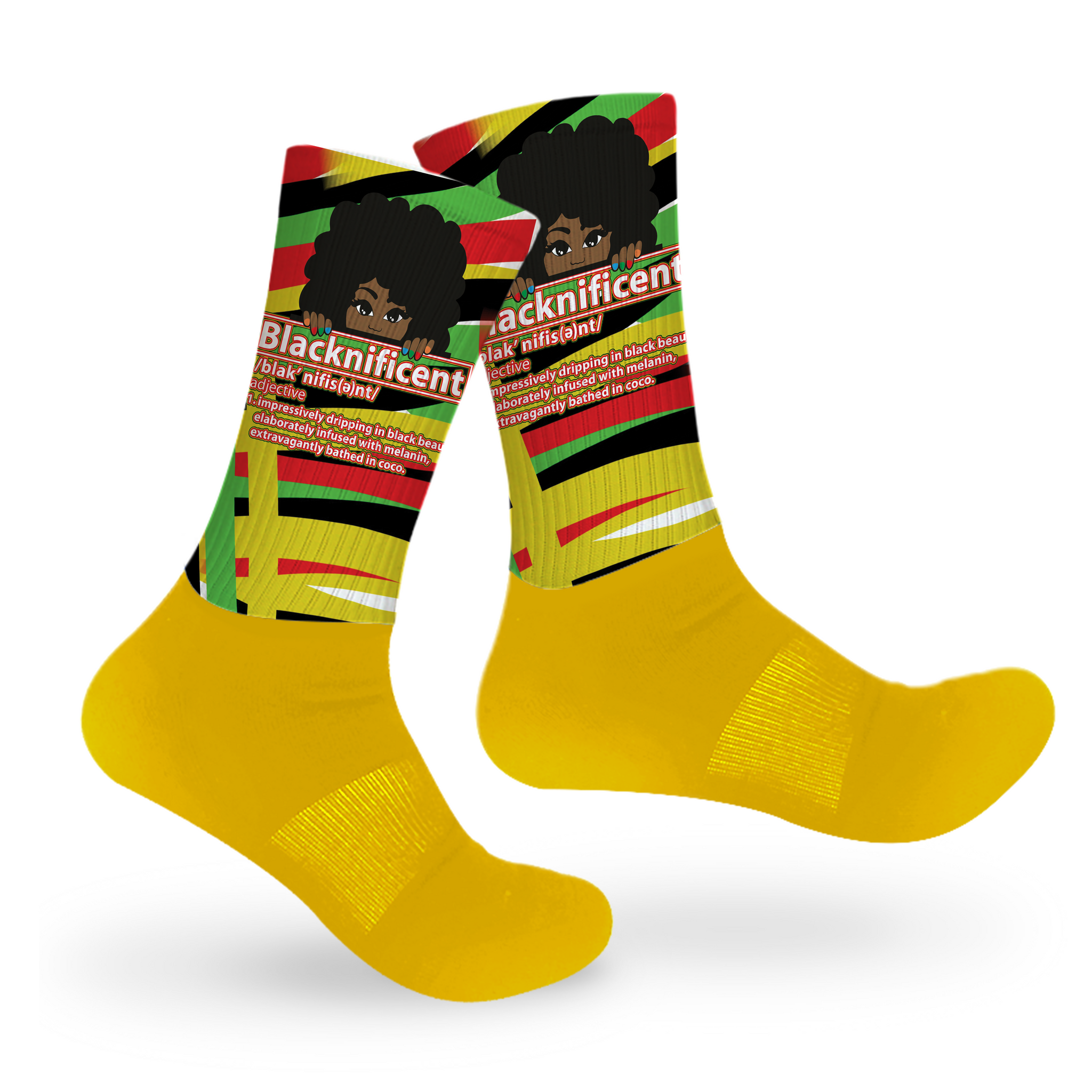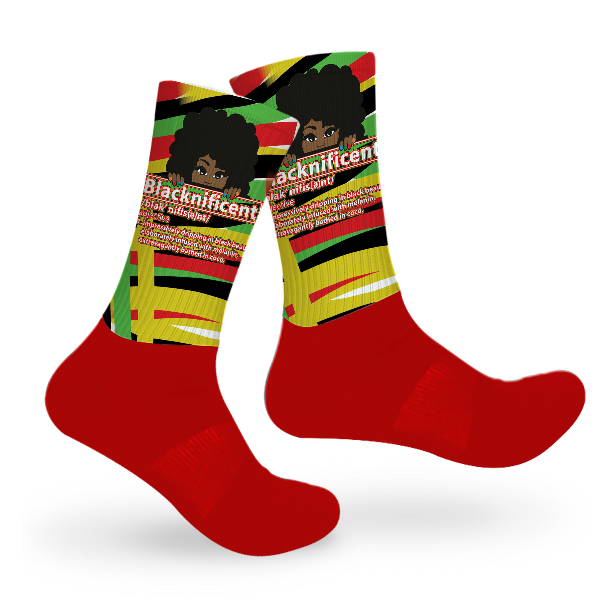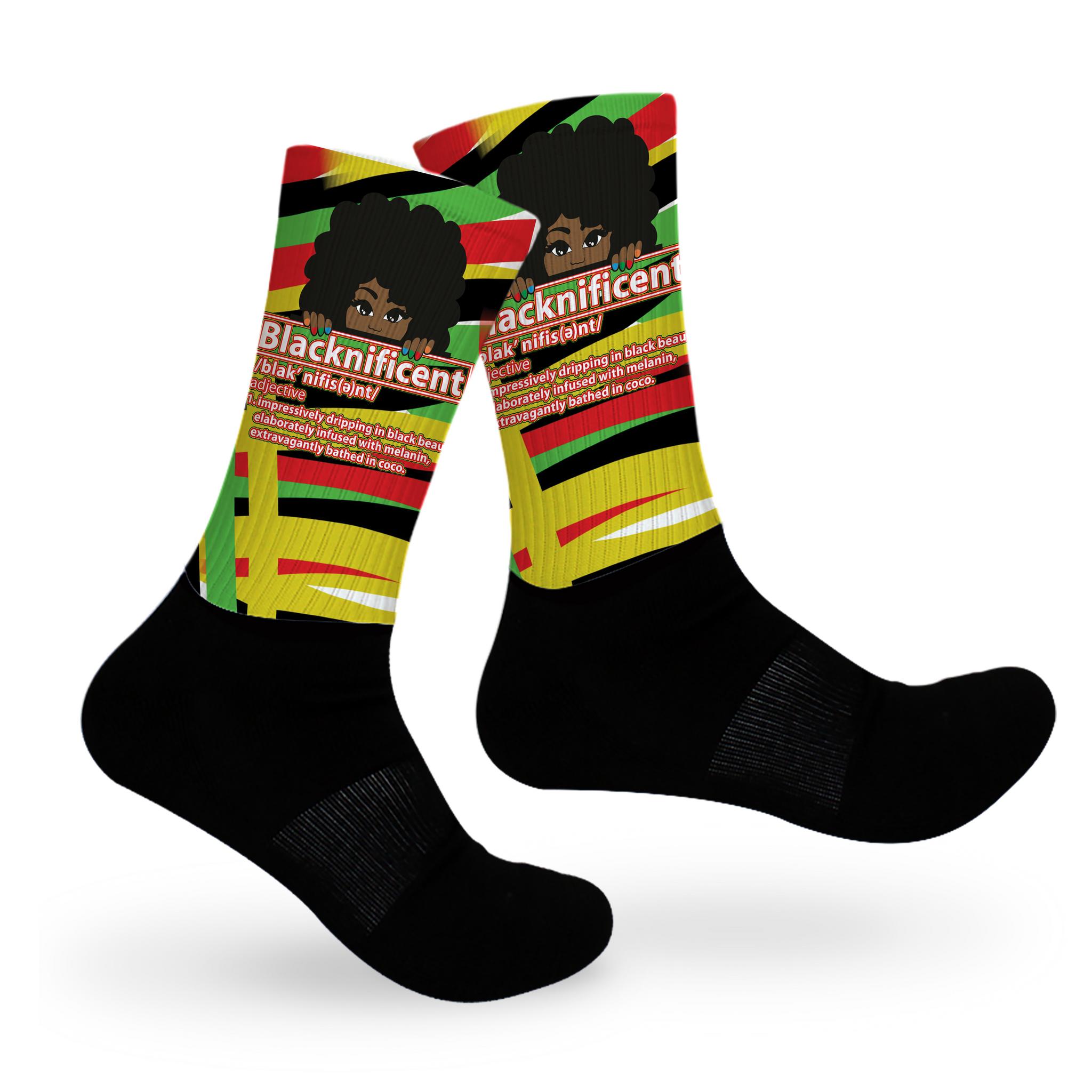 Say it loud! Show your pride with this blacknificent pair in bold, traditional African colors. One of our favorites for its message and colors, this style is mid-crew length, with a cushioned dry-fit cotton foot and a high quality print material from the ankle up.