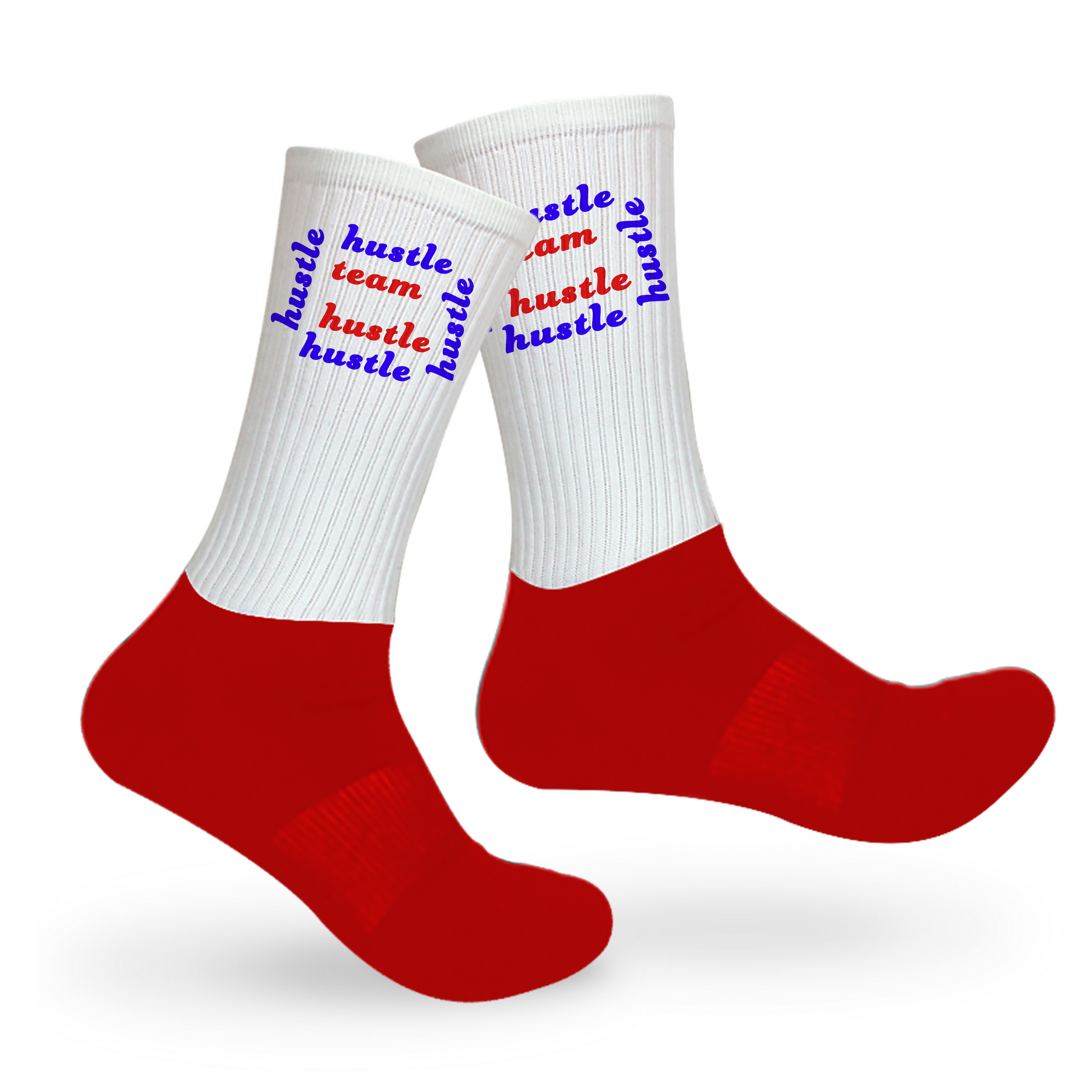 Like making a statement? If so, these are the socks for you! These "Hustle Team, Hustle Hustle" socks are the perfect statement. This style is mid-crew length, with a cushioned dry-fit cotton foot and a high quality print material from the ankle up.