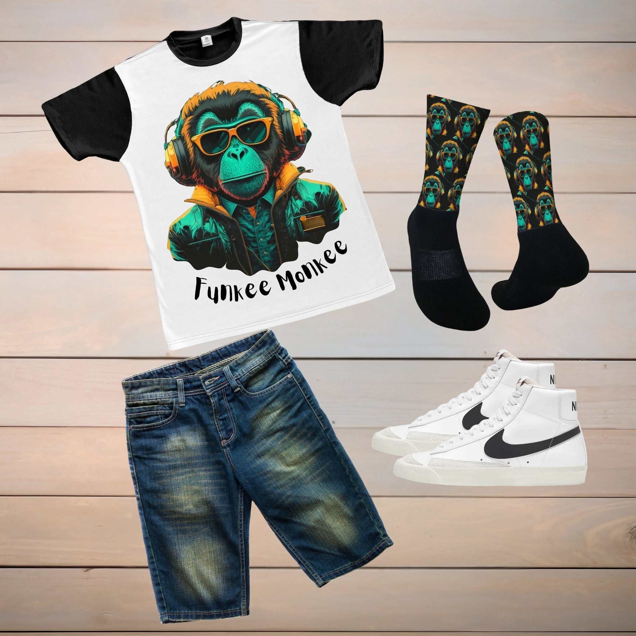 "Chill Mode: Activated ๐๐งโจ This monkey's business is all about the beats and the vibe. With slick shades, headphones, and a fresh jacket, he's a vibe all by himself! Perfect companion to the Funkee Monkey Black Out Tee!