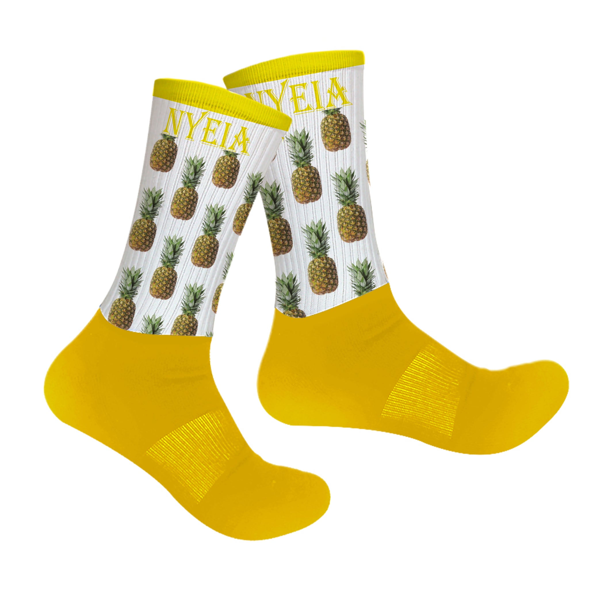 Bring the sun and the fun with these pineapple printed socks. Bright and tropical, these pineapple socks, along with the addition of your name are sure to turn heads. This style is mid-crew length, with a cushioned dry-fit cotton foot and a high quality print material from the ankle up.